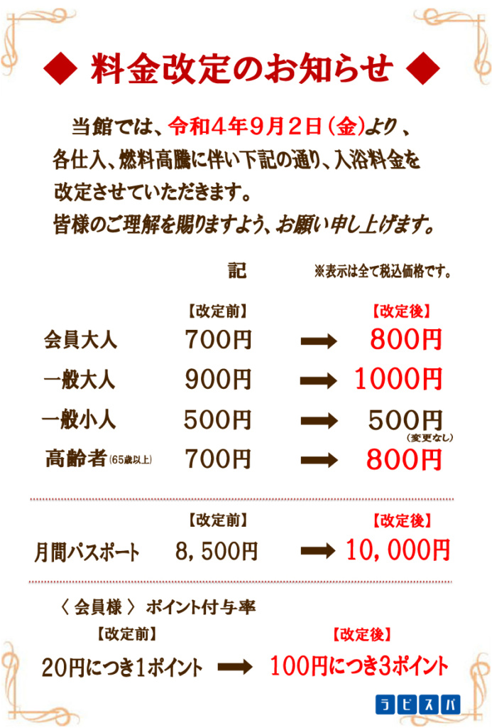 入浴料金を改定させて頂くことになりました。