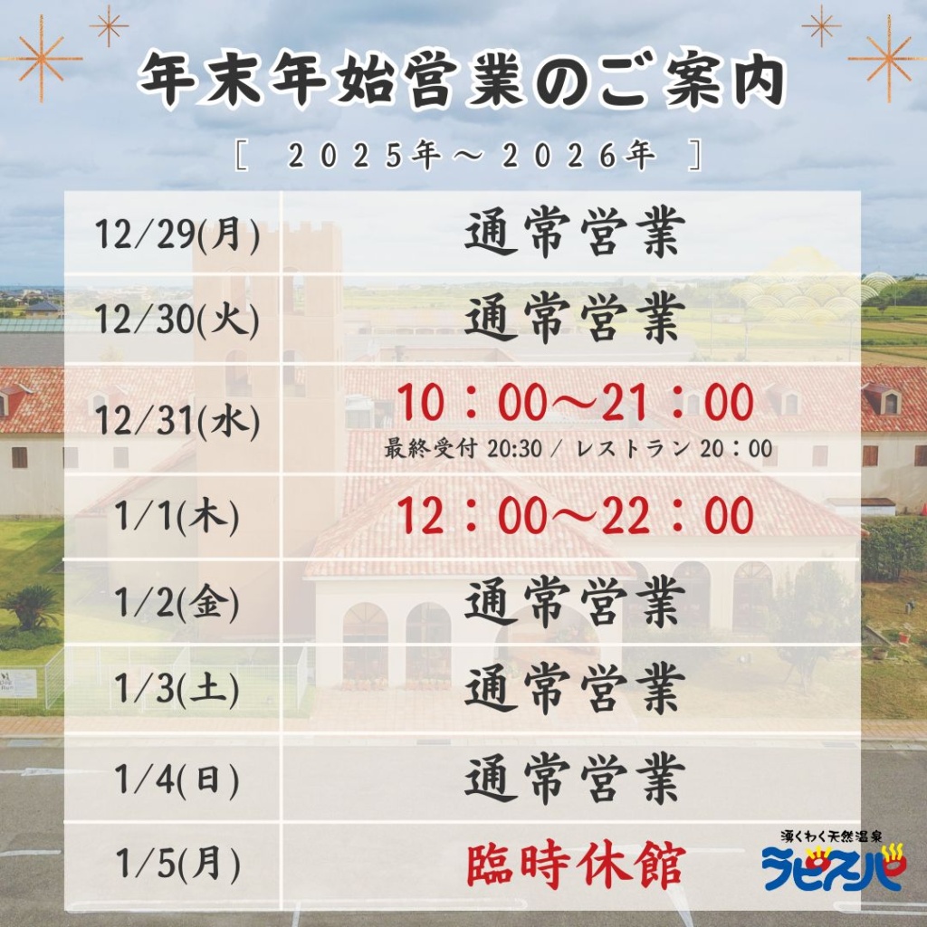 年末年始はラピスパの温泉でリラックスしませんか?